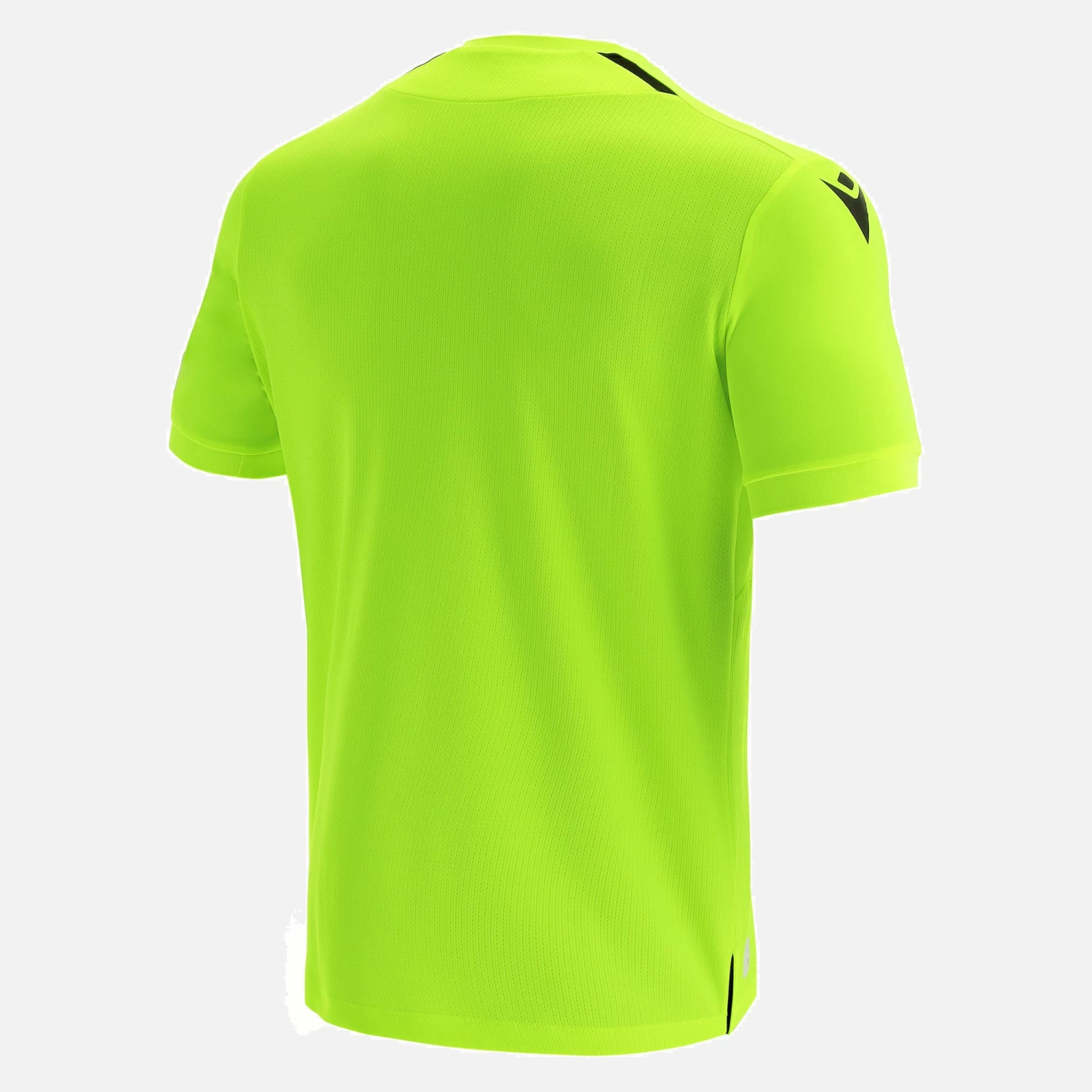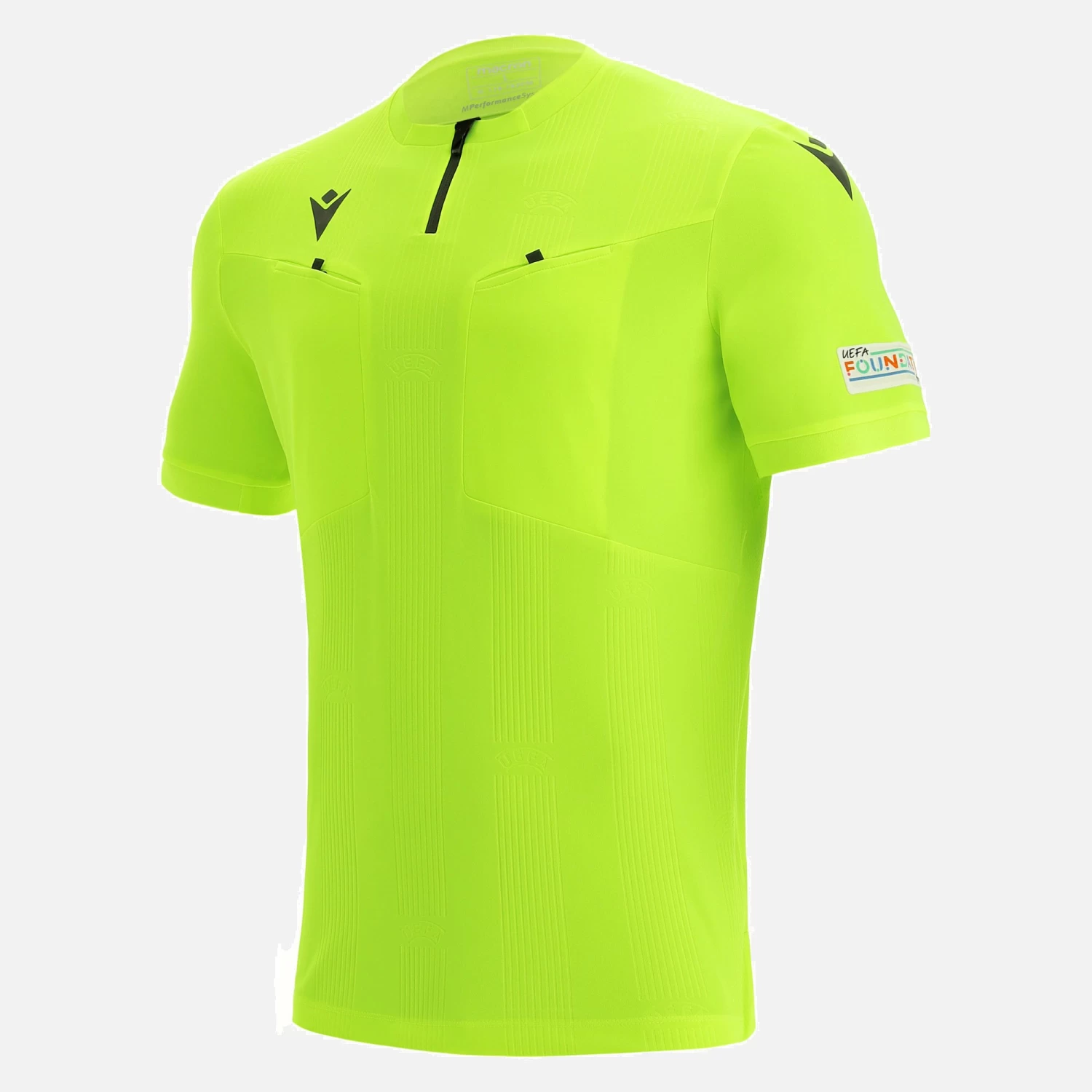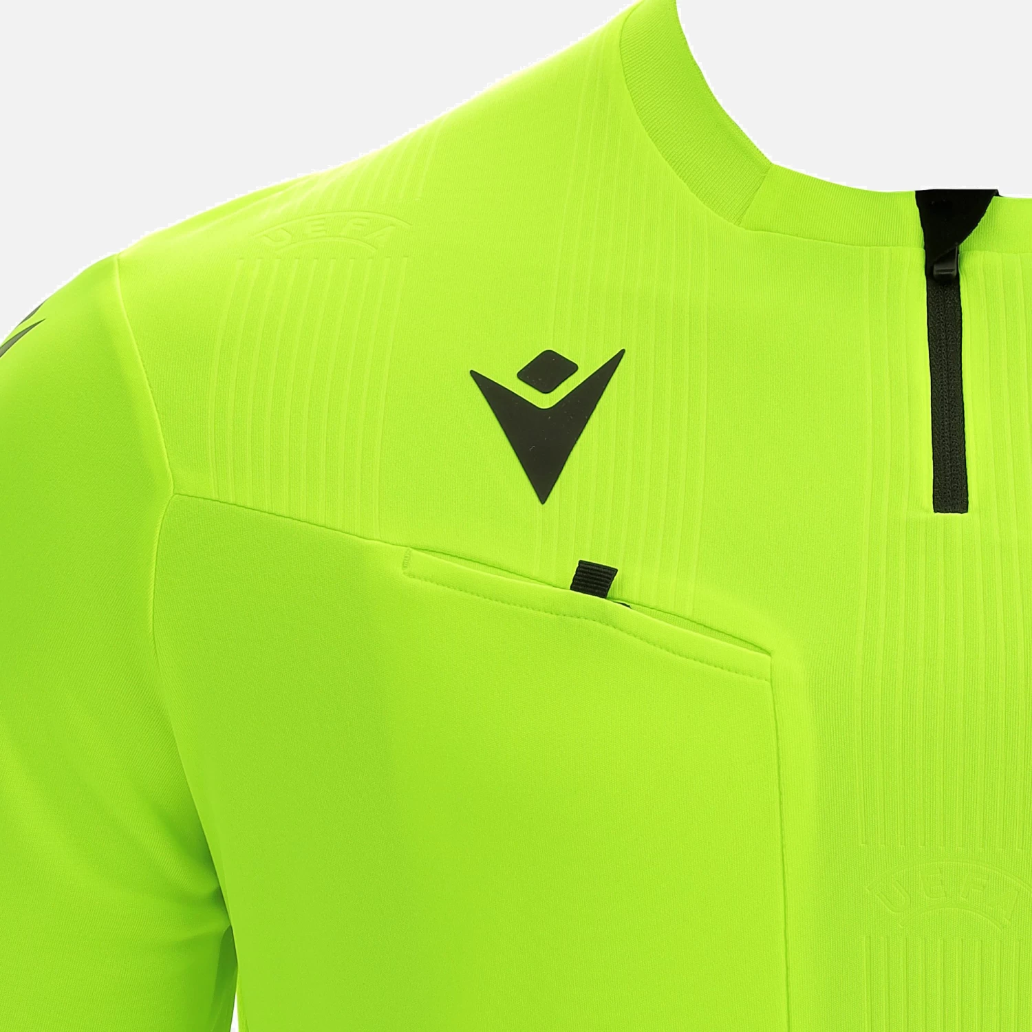 The new referee shirt produced by Macron for UEFA comes in neon yellow for a striking design. Featuring an embossed pinstripe design, the shirt is embellished with 2 large front pockets with velcro closure and the wording ‘Uefa Foundation’ on the left arm.
