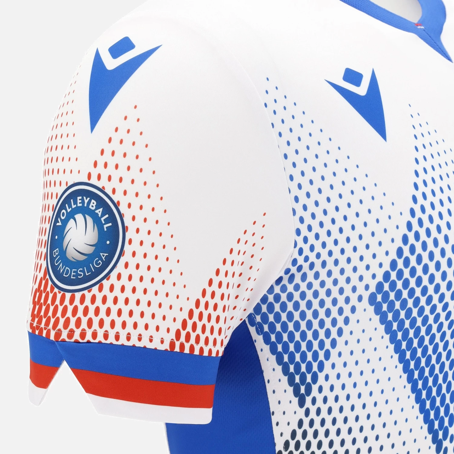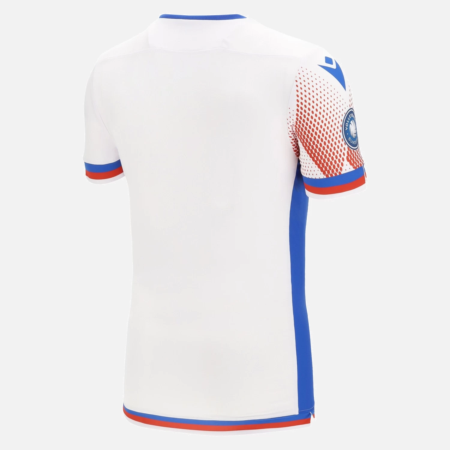 The new United Frankfurt Volleys 2021/22 away shirt sports a striking red and blue diamond print with a faded effect on a white background. The front of the shirt is embellished with the club badge on the left breast and stripes on the sleeves and at the bottom of the jersey.