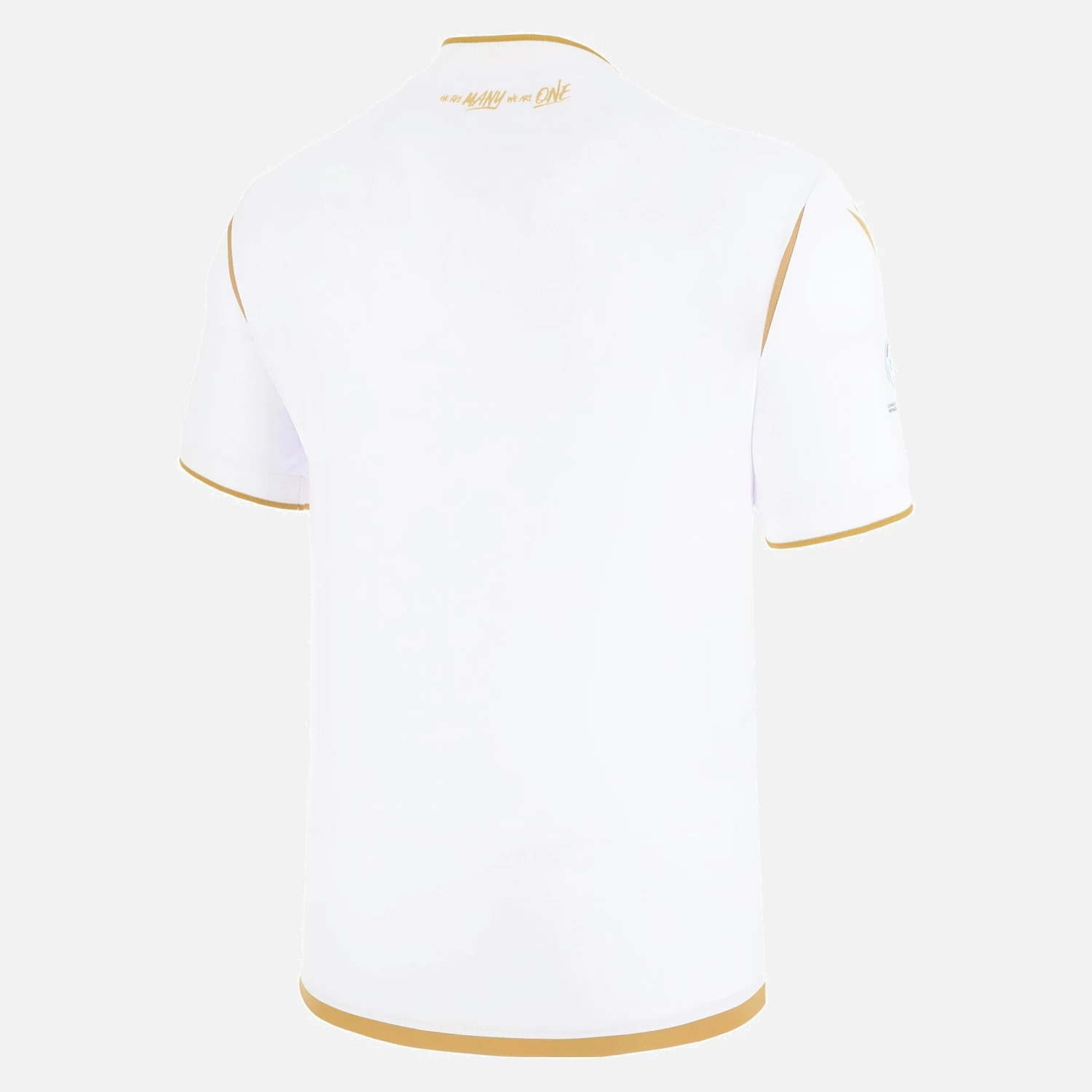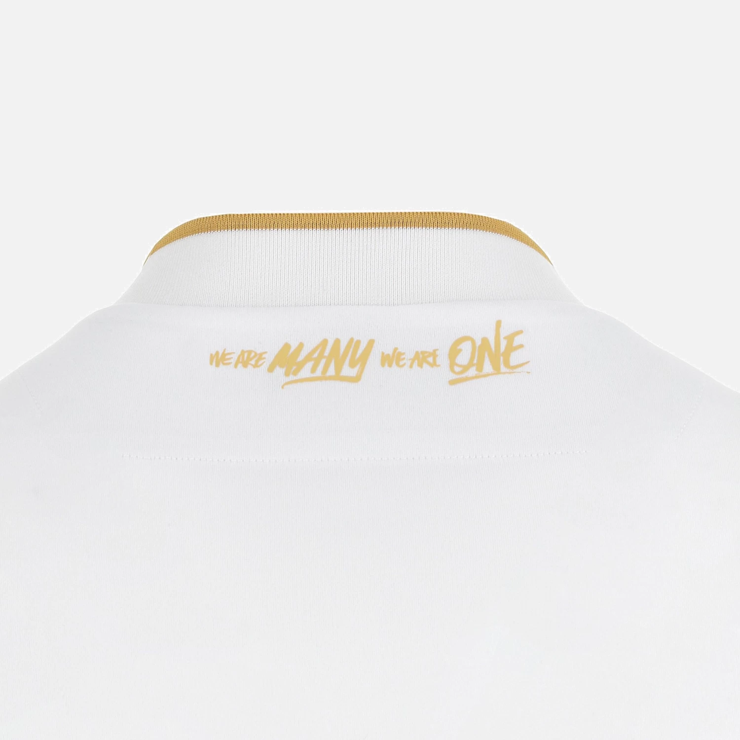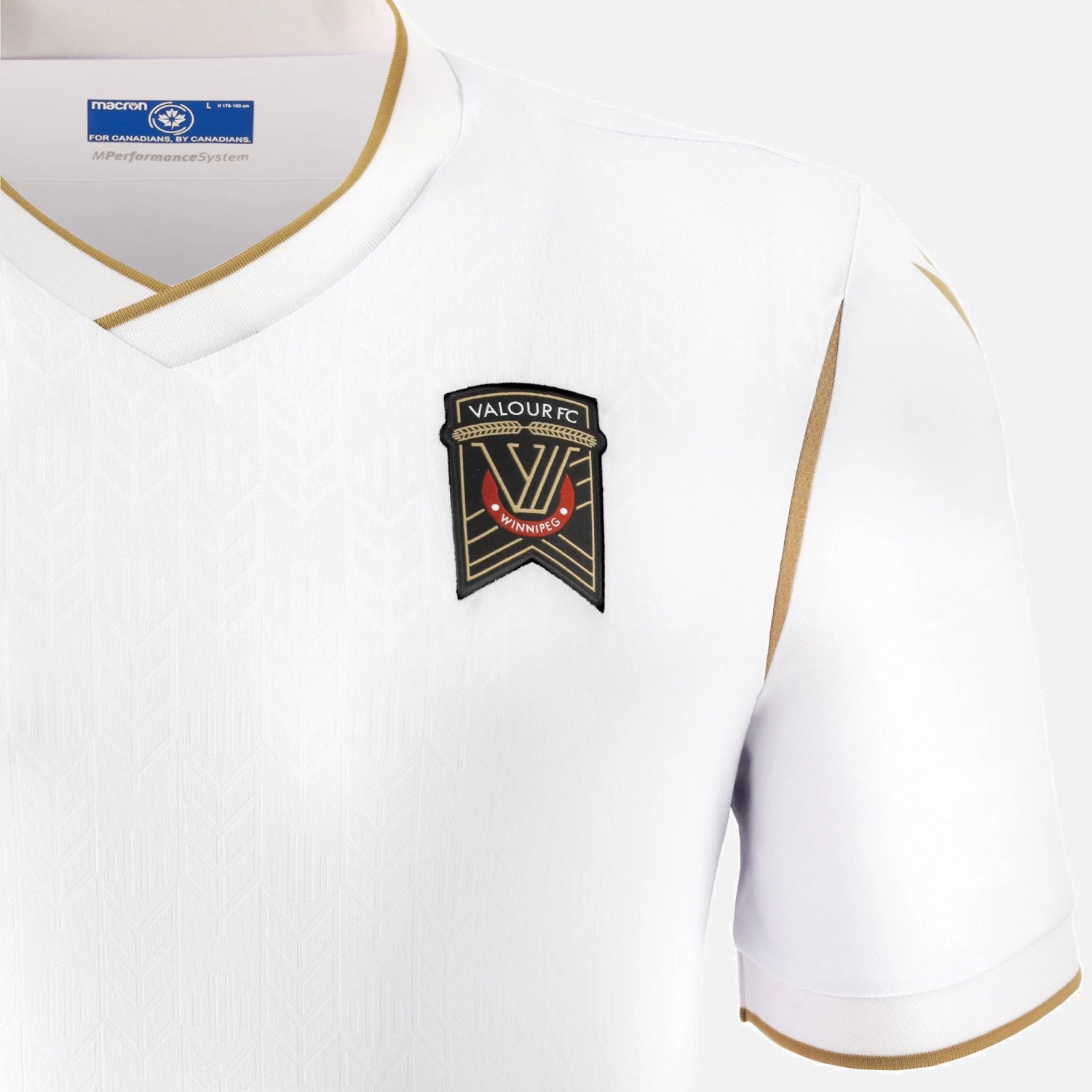 The colour white of the new Valour FC 2022/23 alternate shirt represents the snow which covers the Manitoba prairies in winter. The embossed pattern on the front recalls the shape of wheat, the region’s symbol and synonymous with growth and the fields reawakening after the long winter frost. The gold hue of the detailing on the collar, cuffs and hem of the shirt adds a touch of elegance. The back of the neck is customised with the motto: WE ARE MANY WE ARE ONE.