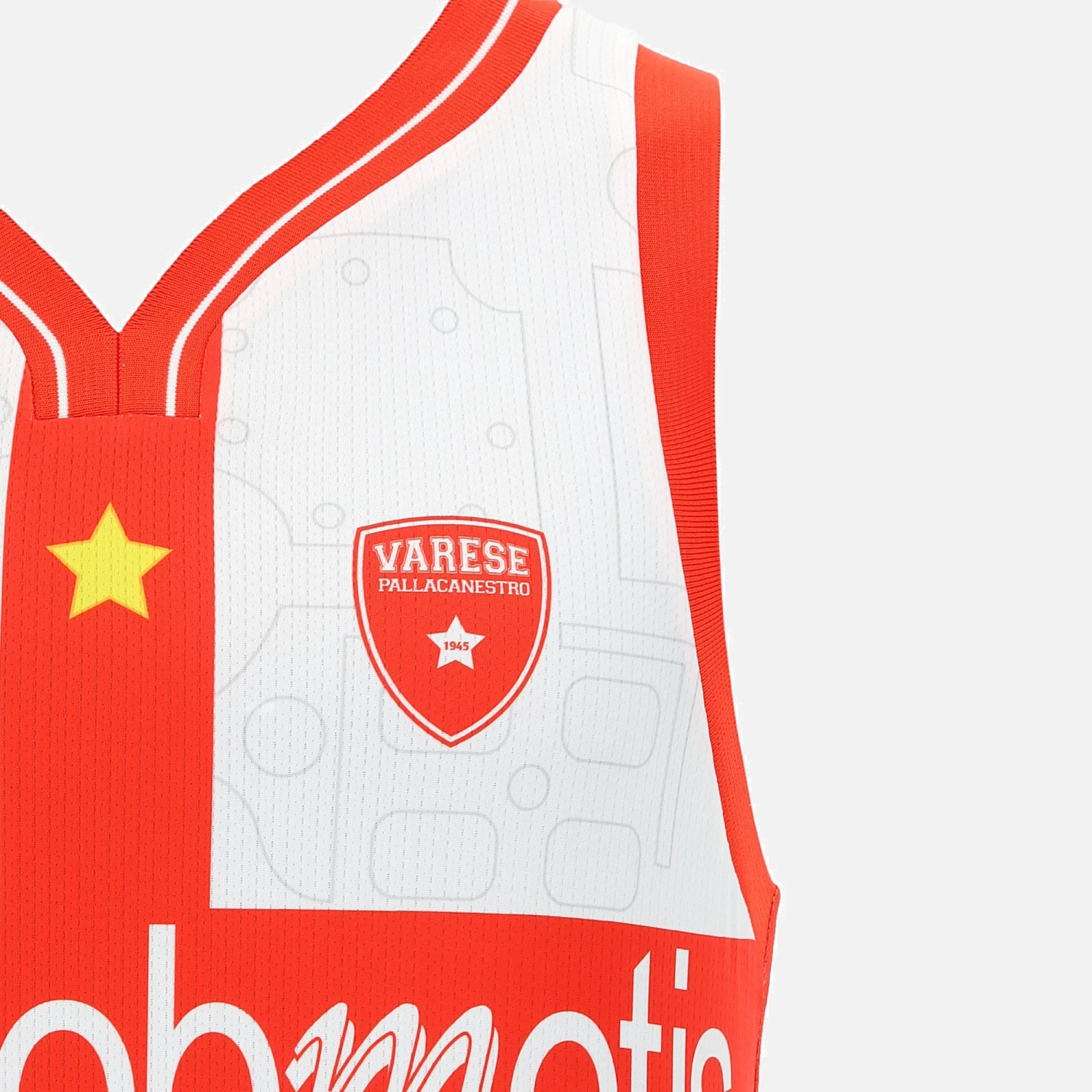 The Pallacanestro varese 2021/22 home game tank is white with red detailing and a golden star in the middle of the chest. A very particular pattern distinguishes the entire garment, on both the front and back. The shape of the collar lends the garment an elegant touch. Are you read to shoot some hoops with the new Pallacanestro Varese home tank?!