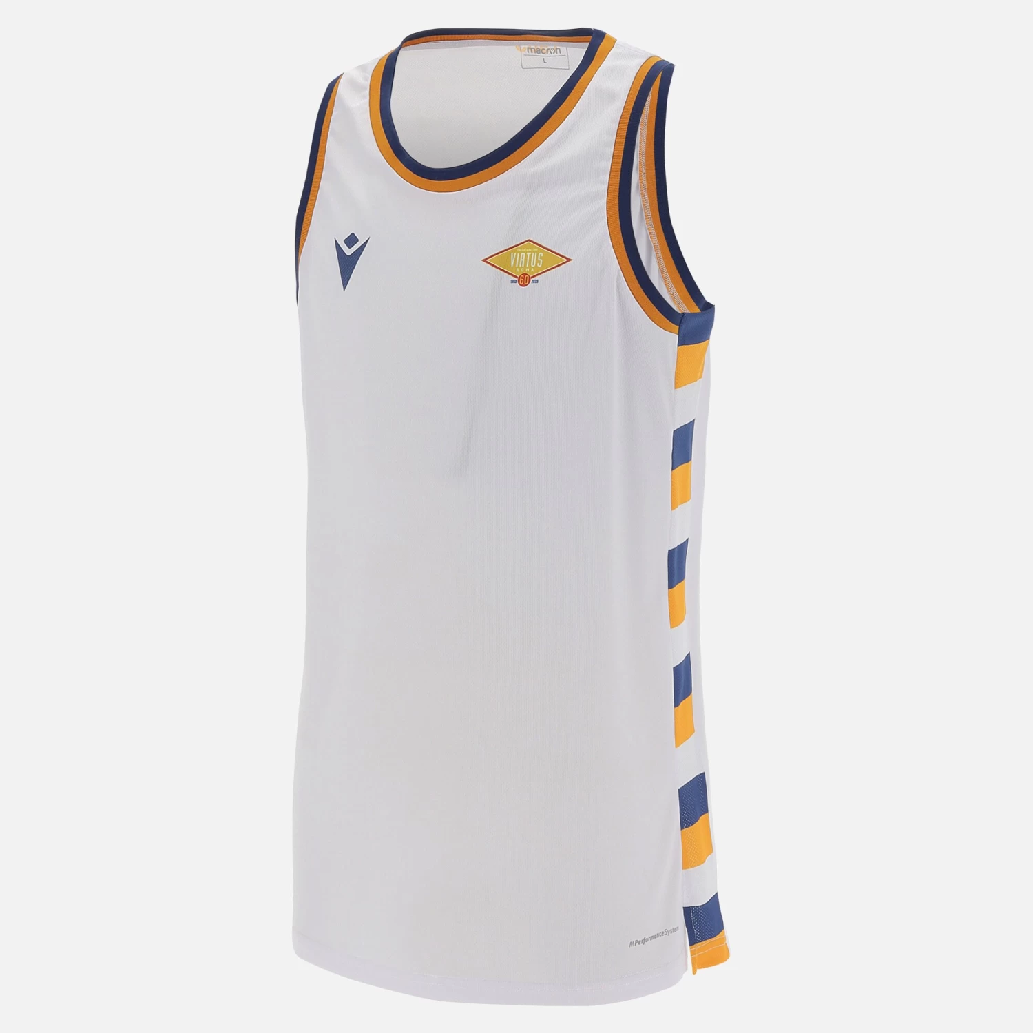A special singlet for a special occasion. You too can celebrate the Virtus Roma basketball team’s 60th anniversary. In keeping with tradition, the shirt is white with blue and orange details on the sides and collar. Round-neck collar and regular fit.