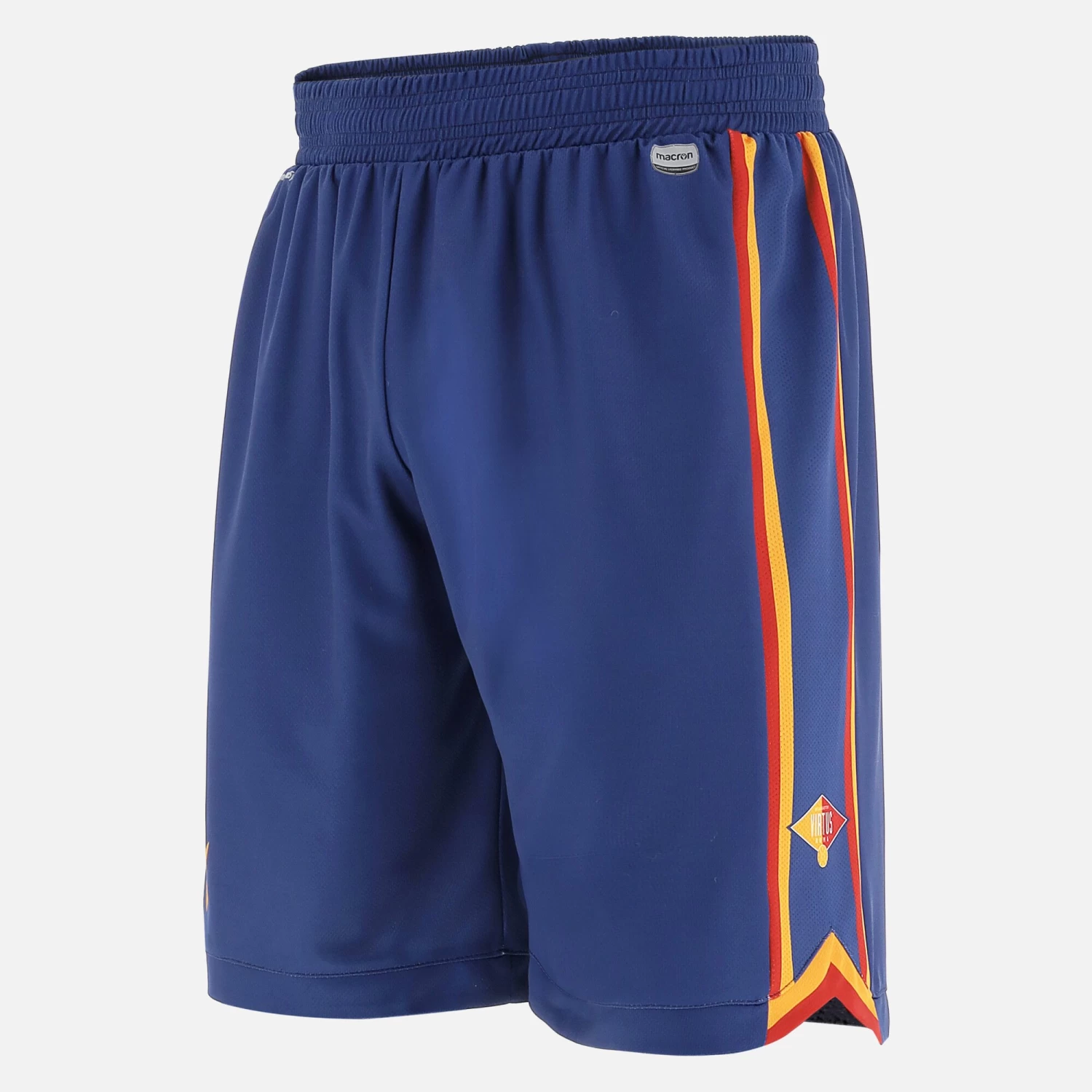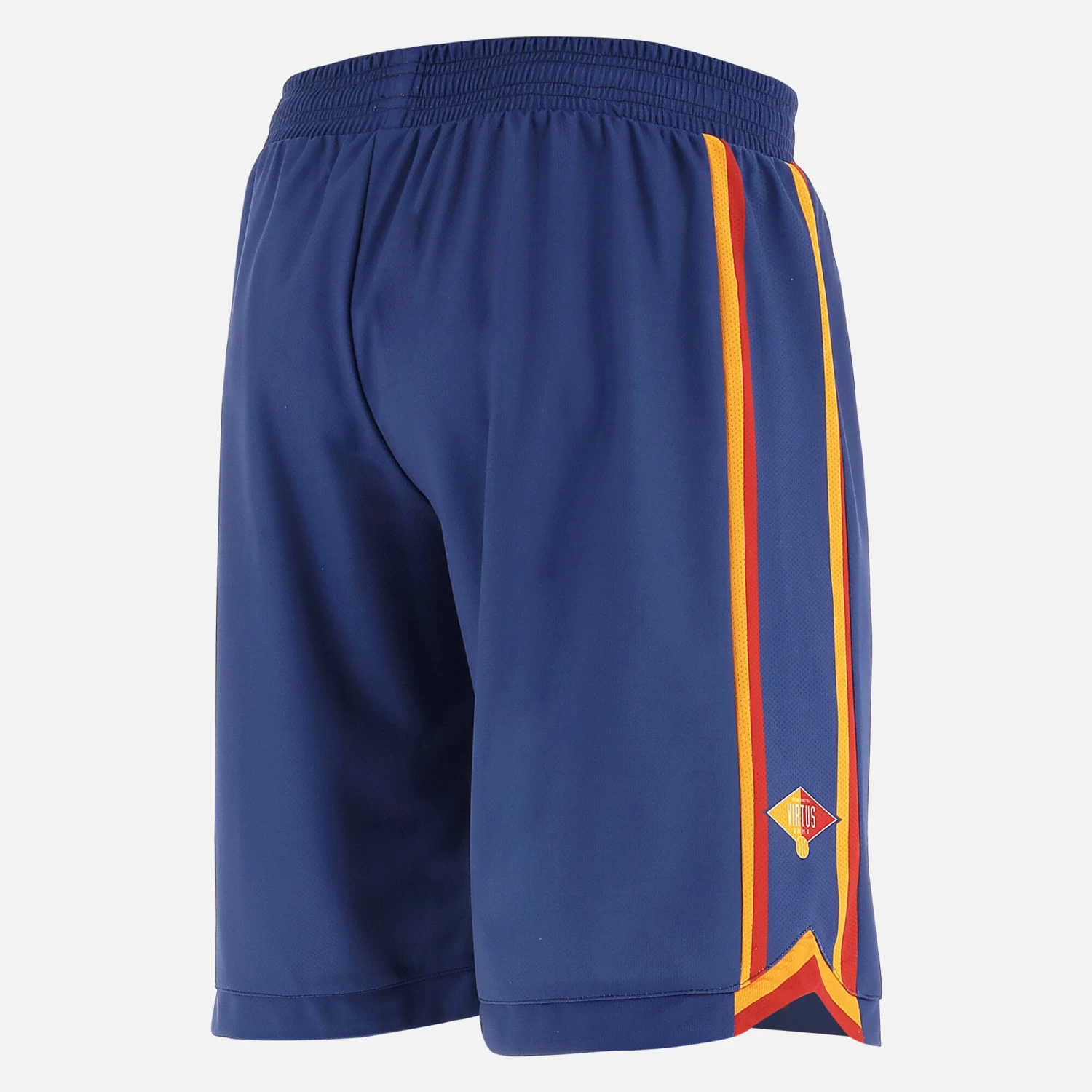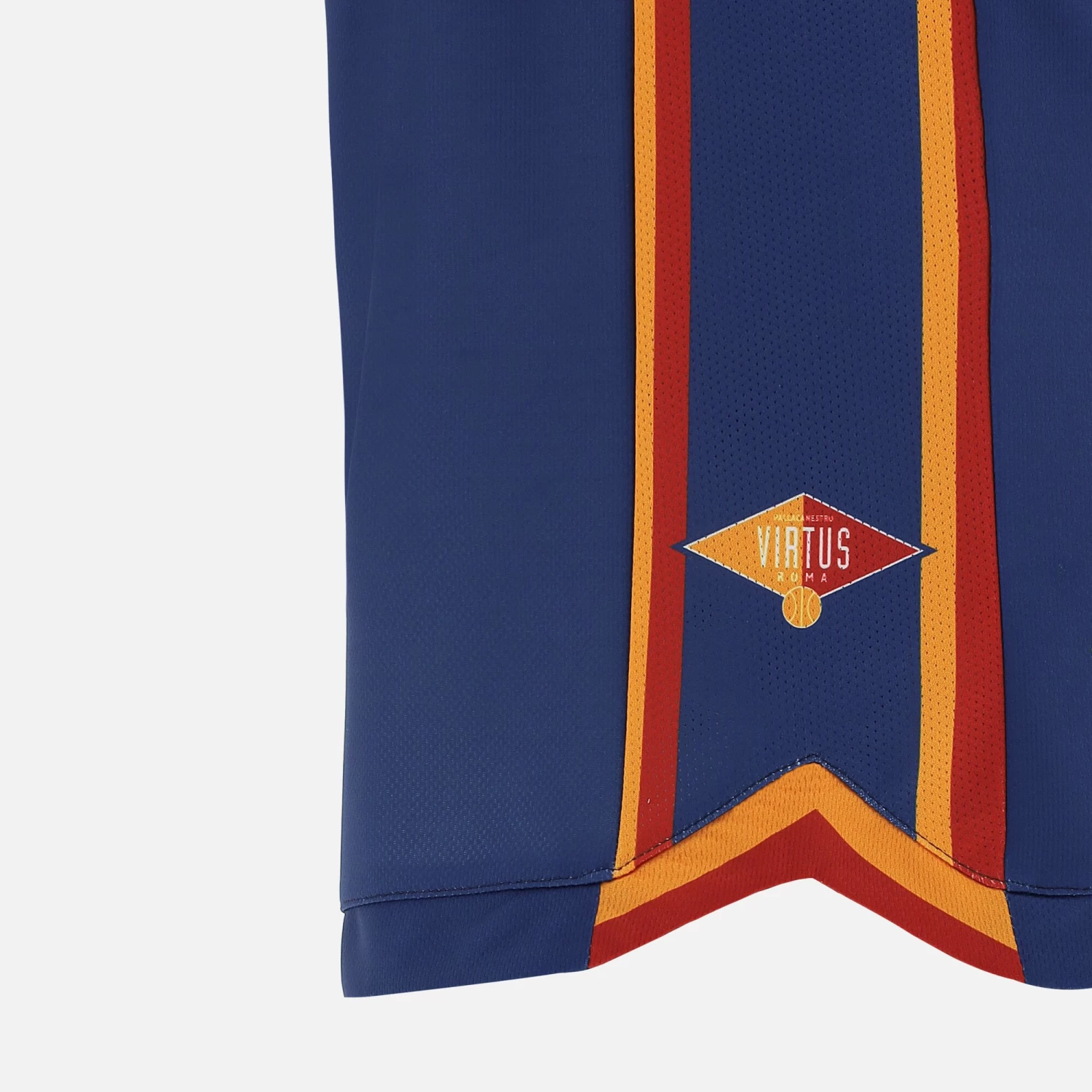 The Virtus Roma basketball team 2020/21 away shorts are blue with dye-sub orange and red inserts on the sides.