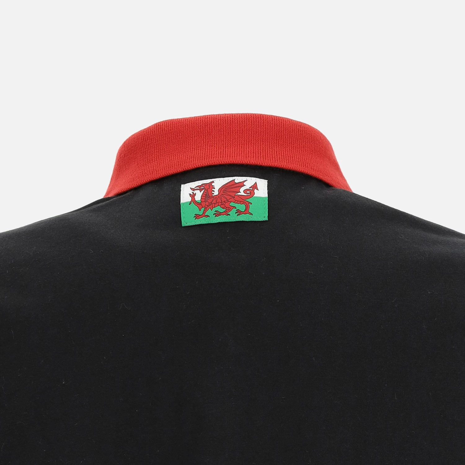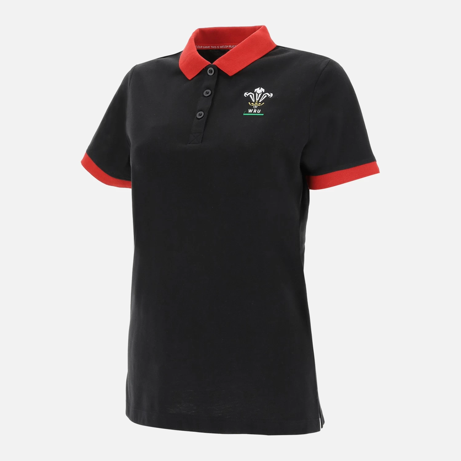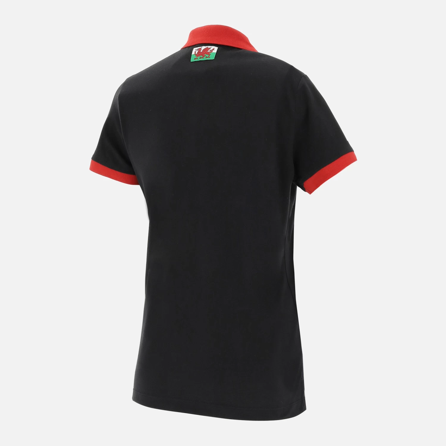 Welsh Rugby Union 2020/21 fans collection women’s polo shirt in soft cotton jersey, black with red details on the collar and sleeves. Button-down collar, embroidered club patch and custom fabric label on the back of the collar.