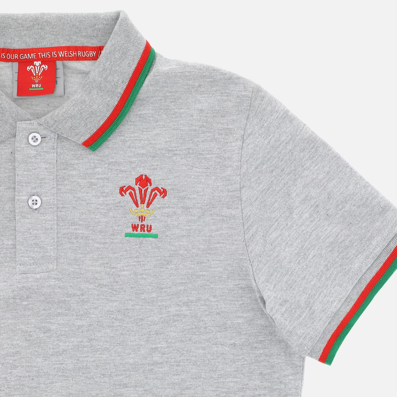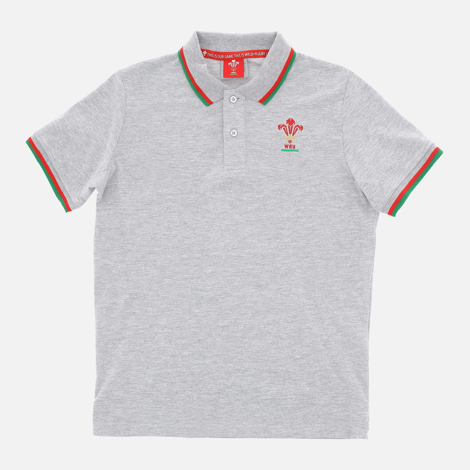 Welsh Rugby Union 2020/21 piquet cotton children’s fans collection polo shirt, lightweight and stylishly elegant. Melange grey with small red and green details on the collar and cuffs.
