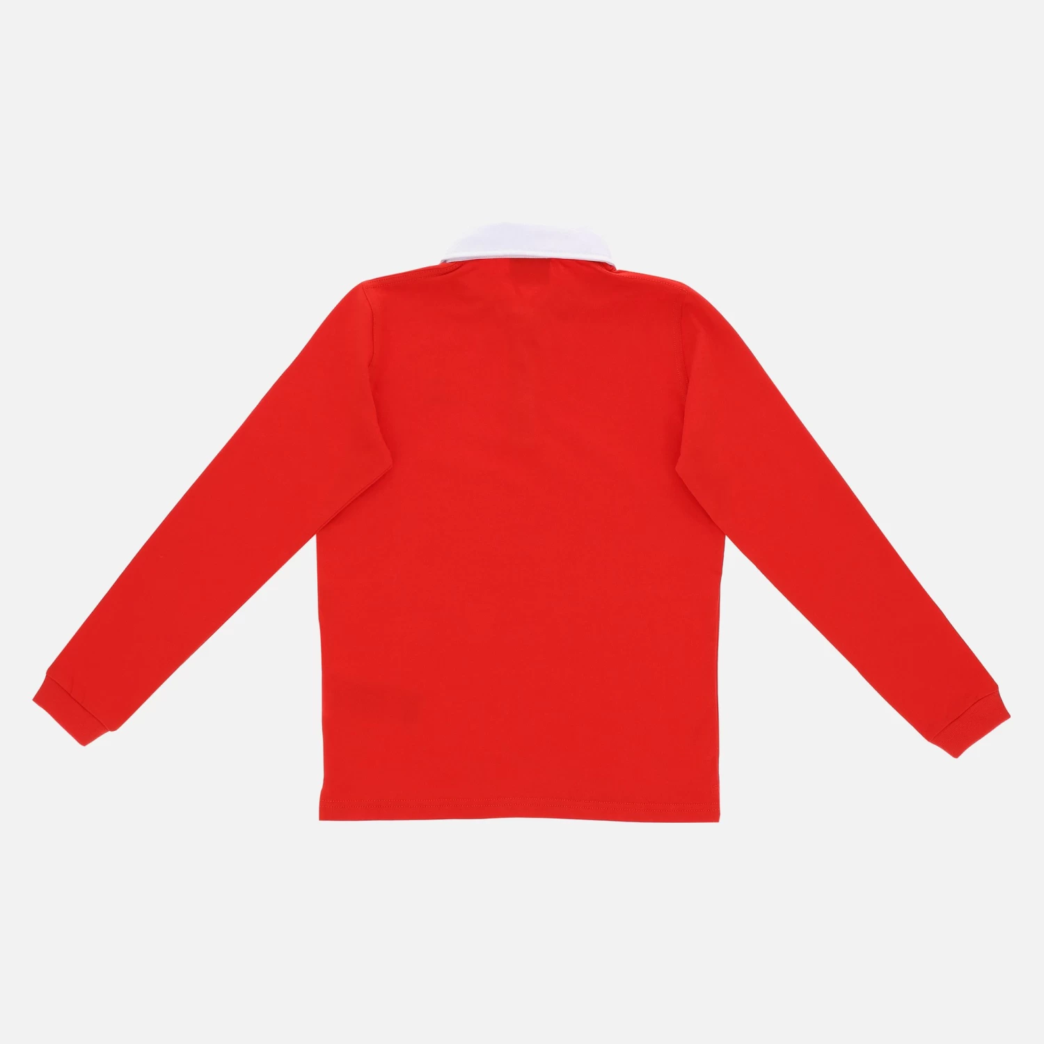 Welsh Rugby Union 2020/21 children’s fans collection polo shirt in heavy piquet cotton with long sleeves, elegantly stylish and comfortable, ideal for the colder days. Red with white collar.