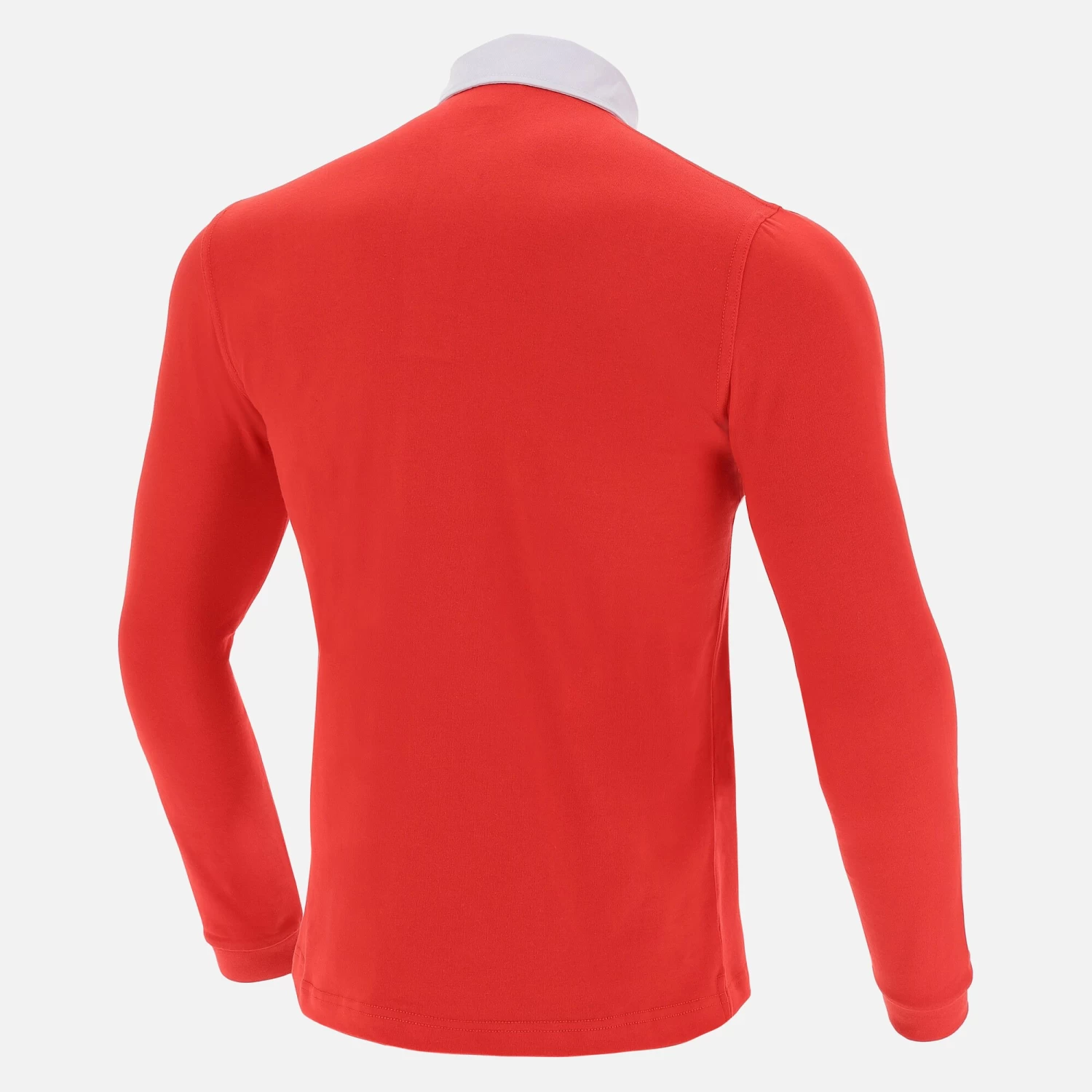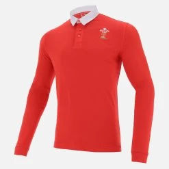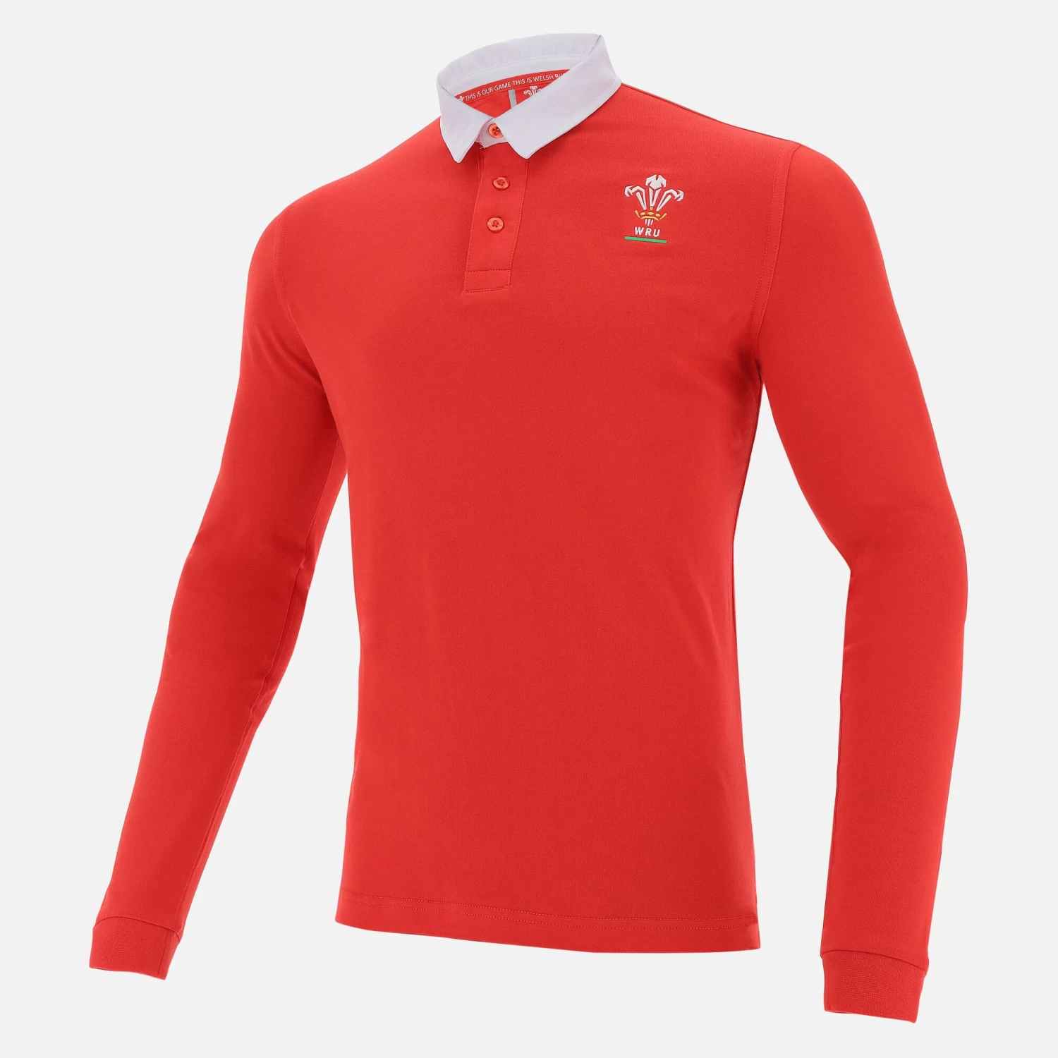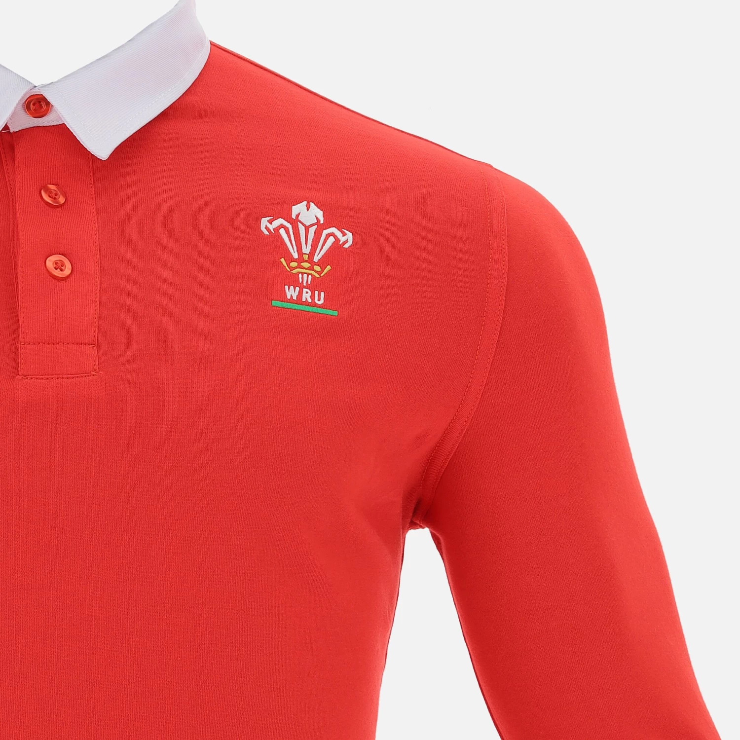 Welsh Rugby Union 2020/21 fans collection polo shirt in heavy piquet cotton with long sleeves, elegantly stylish and comfortable, ideal for the colder days. Red with white collar.