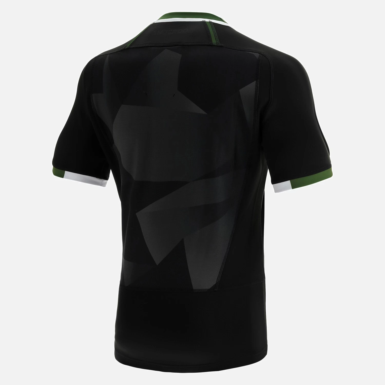 The Official Welsh Rugby Away Replica Jersey for the 2021 season. Black and grey shirt with graphic print across the torso and dark green and white accents on the collars and cuffs and the Welsh Rugby Crest embroidered over the heart. This shirt is standard fit, with short sleeves and produced using polyester making it perfect for cheering on the squad from the stands.