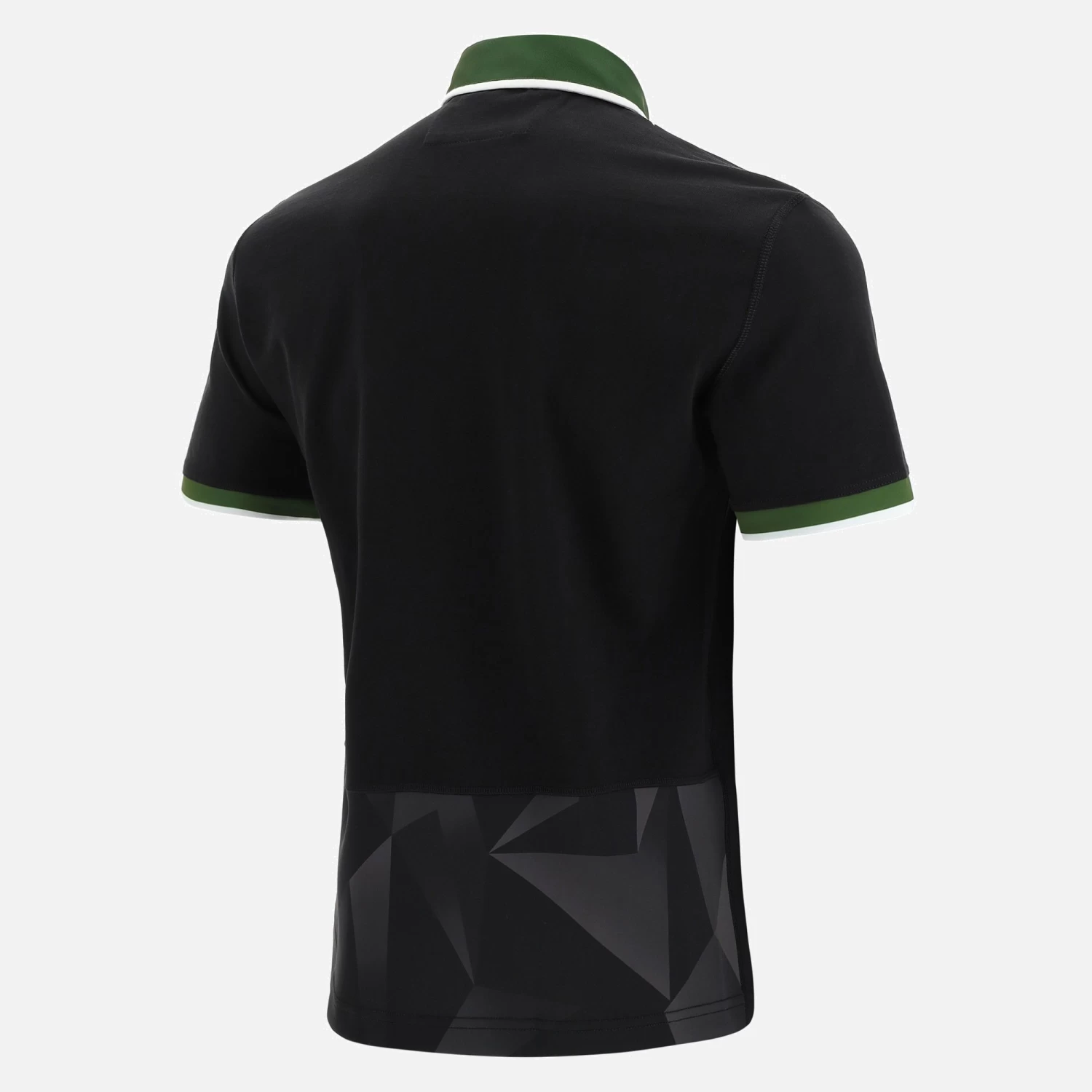 The Official Welsh Rugby Away Cotton Jersey for the 2021/22 season. Black and grey shirt with graphic print across the torso and dark green and white accents on the collars and cuffs and the Welsh Rugby Crest embroidered over the heart. This traditional cotton jersey is loose fit with short sleeves for those that love the classic rugby shirt style.