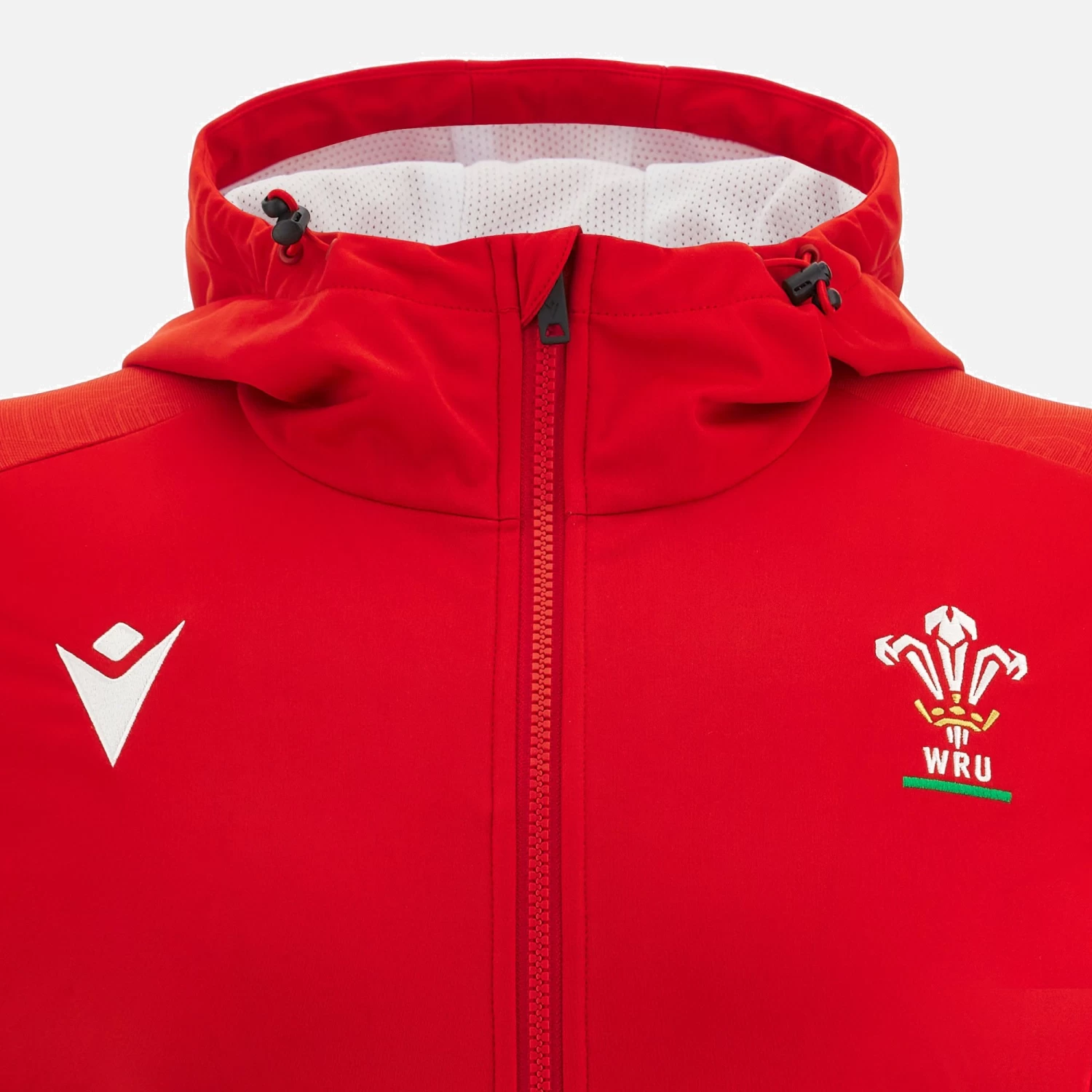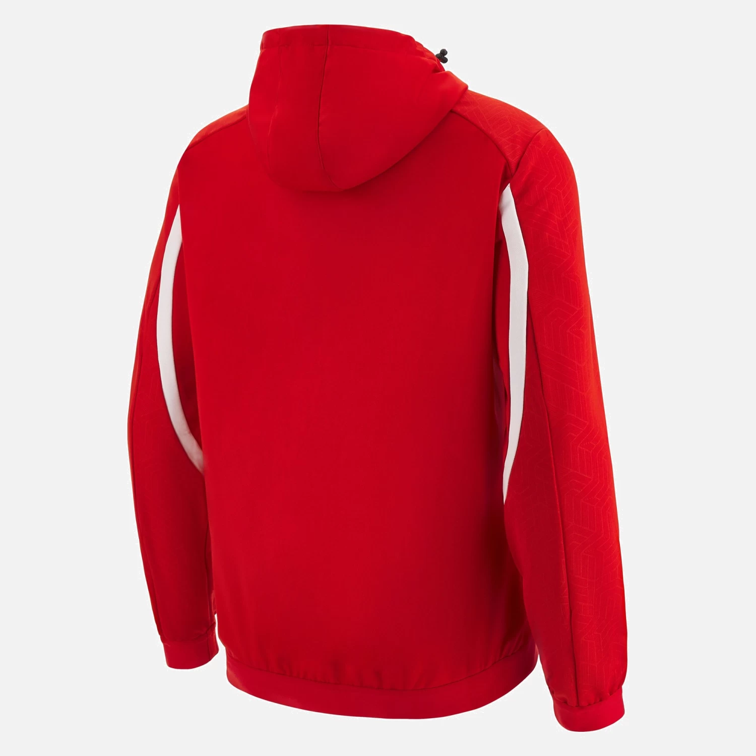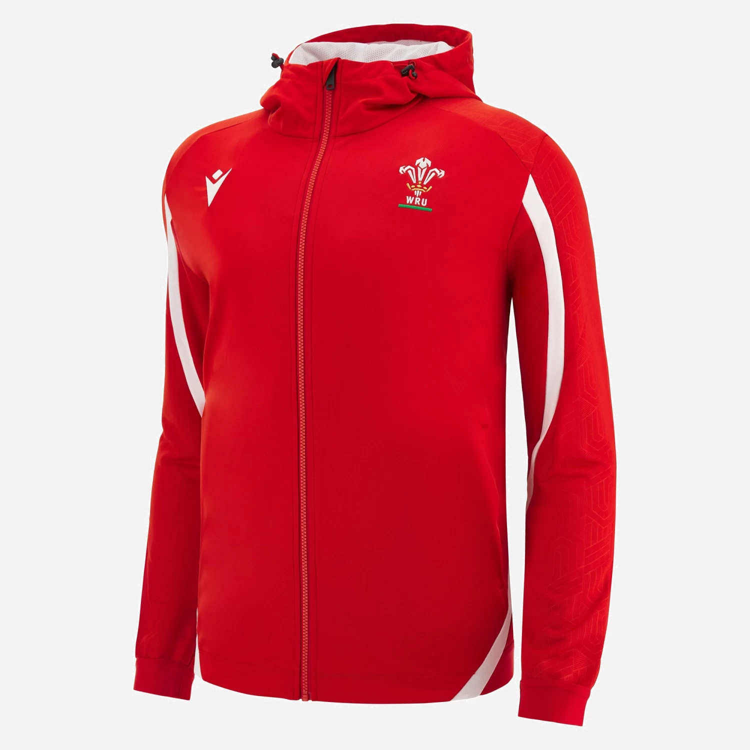 Red anthem jacket with white piping, embossed pattern on the sleeves and embroidered Welsh Rugby crest over the heart.