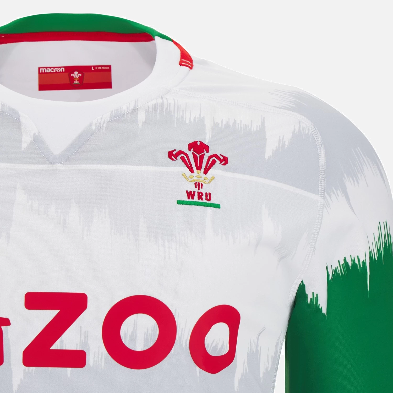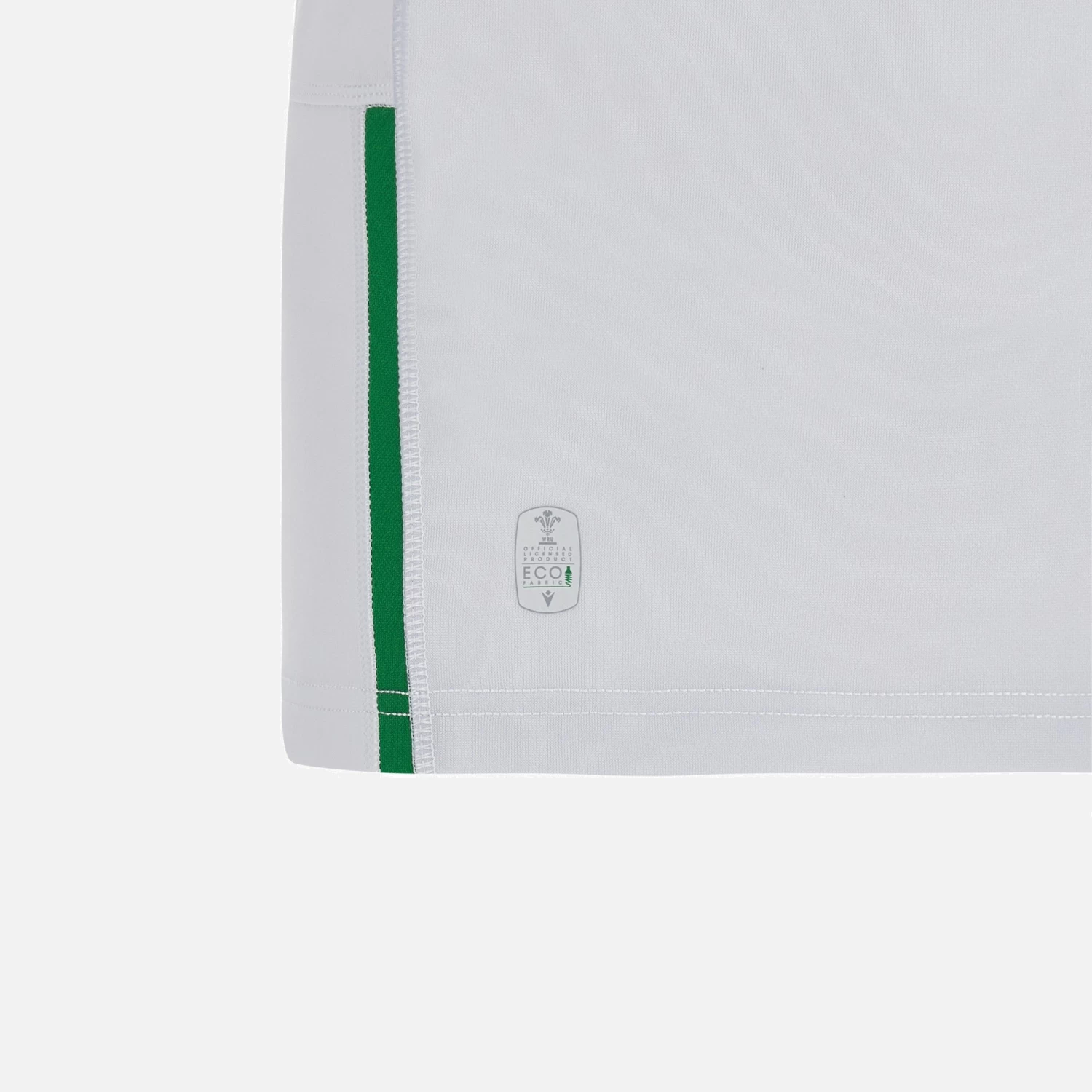 Offical Pathway/7s Away Replica Jersey. White shirt with tone on tone ‘soundwave’ design across the chest, green sleeves, red and white details on the collar and cuffs and Welsh Rugby Crest embroidered over the heart. This shirt is standard fit, with short sleeves and produced using polyester making it perfect for cheering on the squad from the stands.