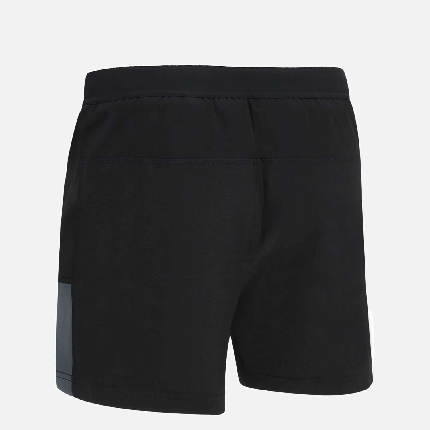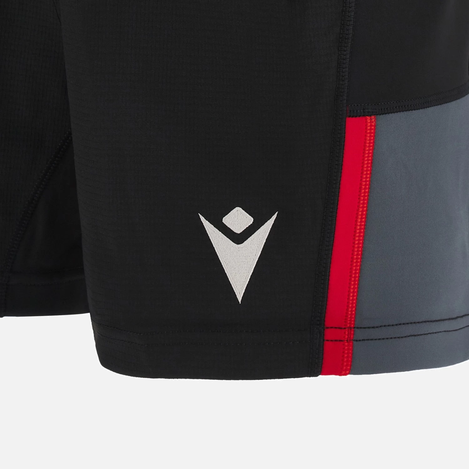 Black rugby fit training shorts with grey panels on the flanks and red piping.