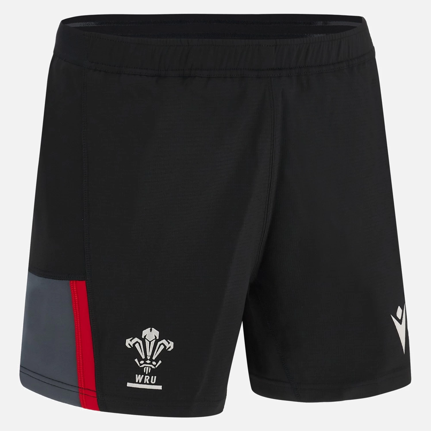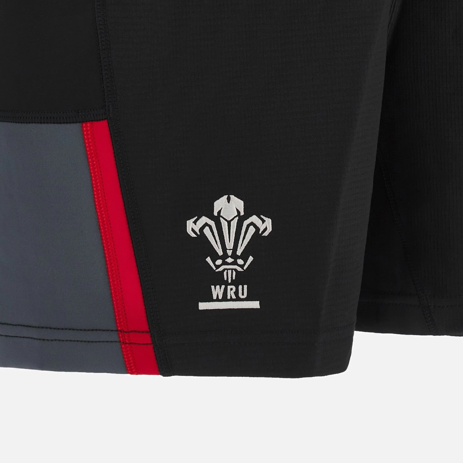 Black rugby fit training shorts with grey panels on the flanks and red piping.