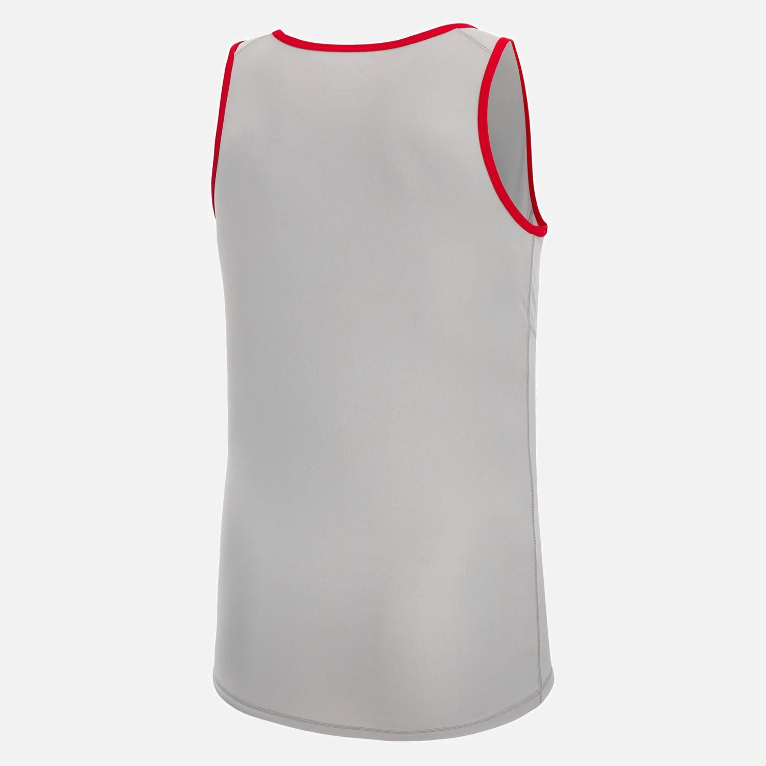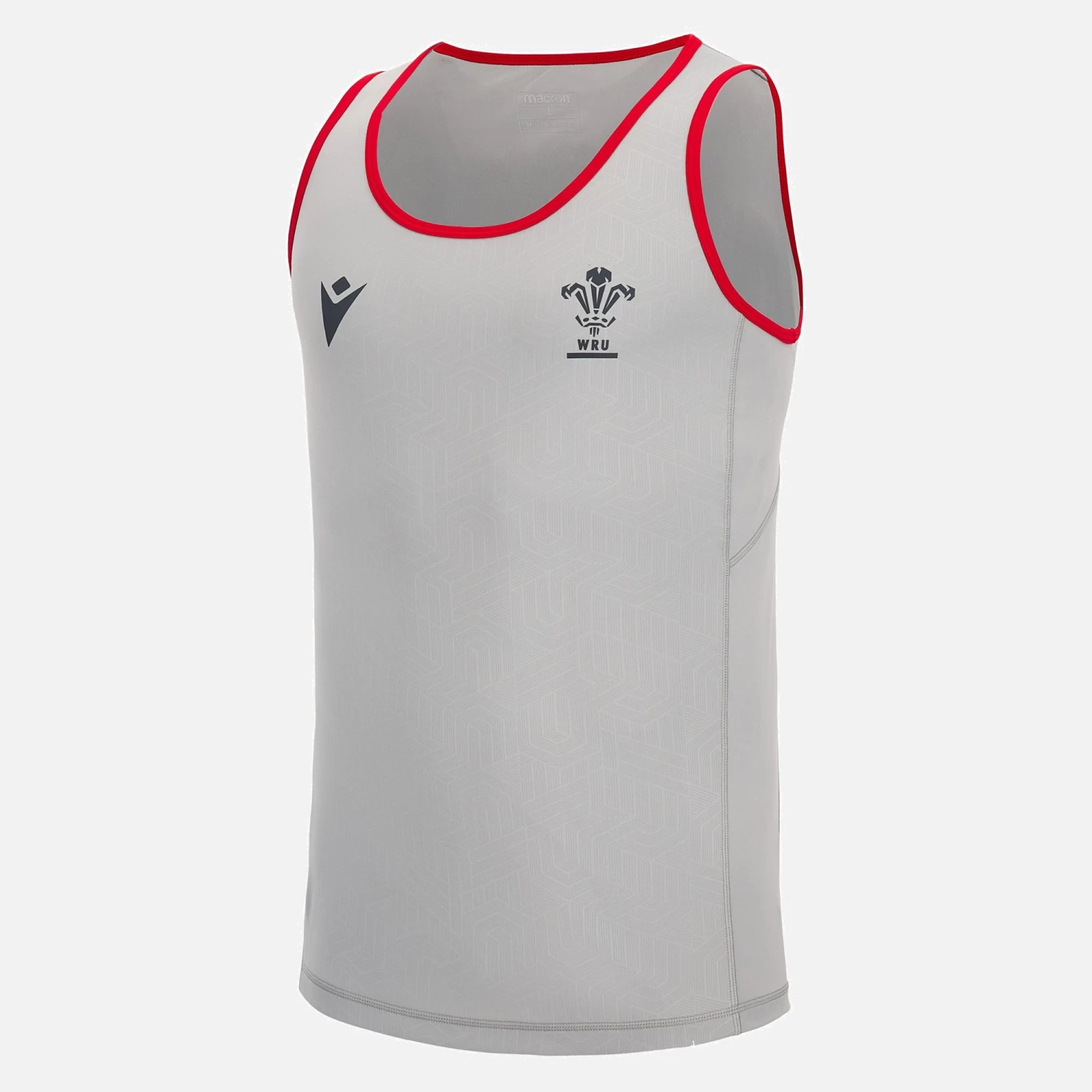Grey lightweight training vest with red piping, geometric embossed pattern across the body and printed Welsh Rugby crest.