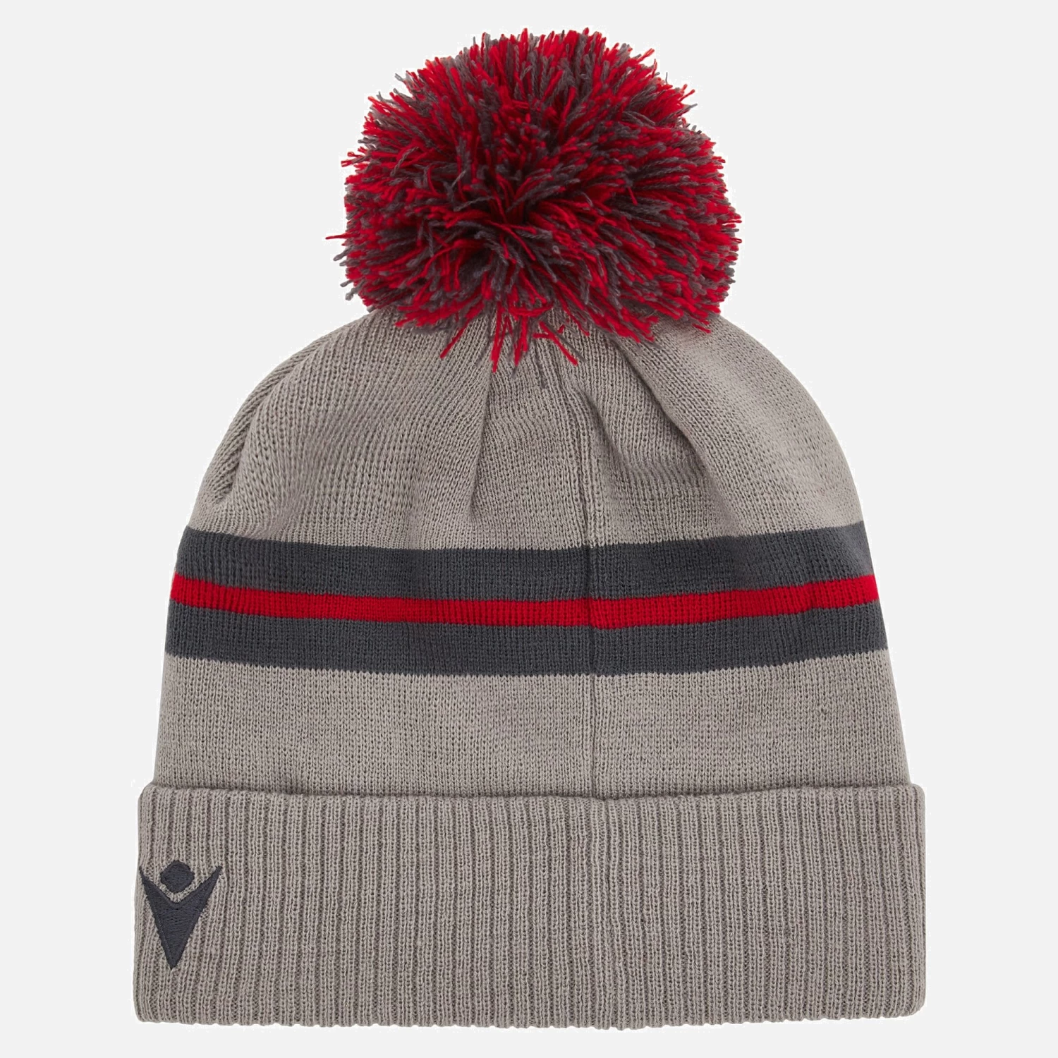 Grey pom pom beanie with charcoal and red stripe and 3D embroidered Welsh Rugby crest.