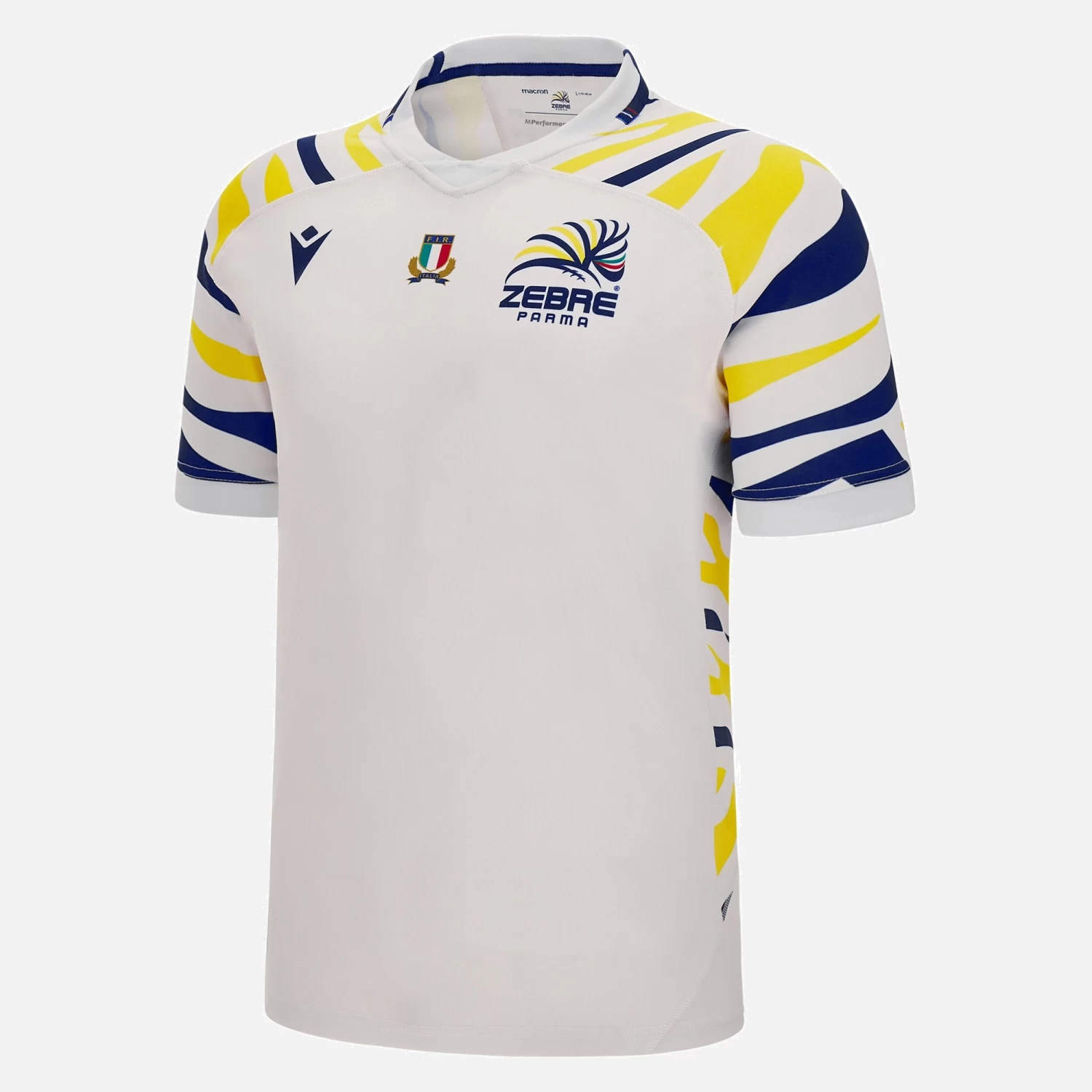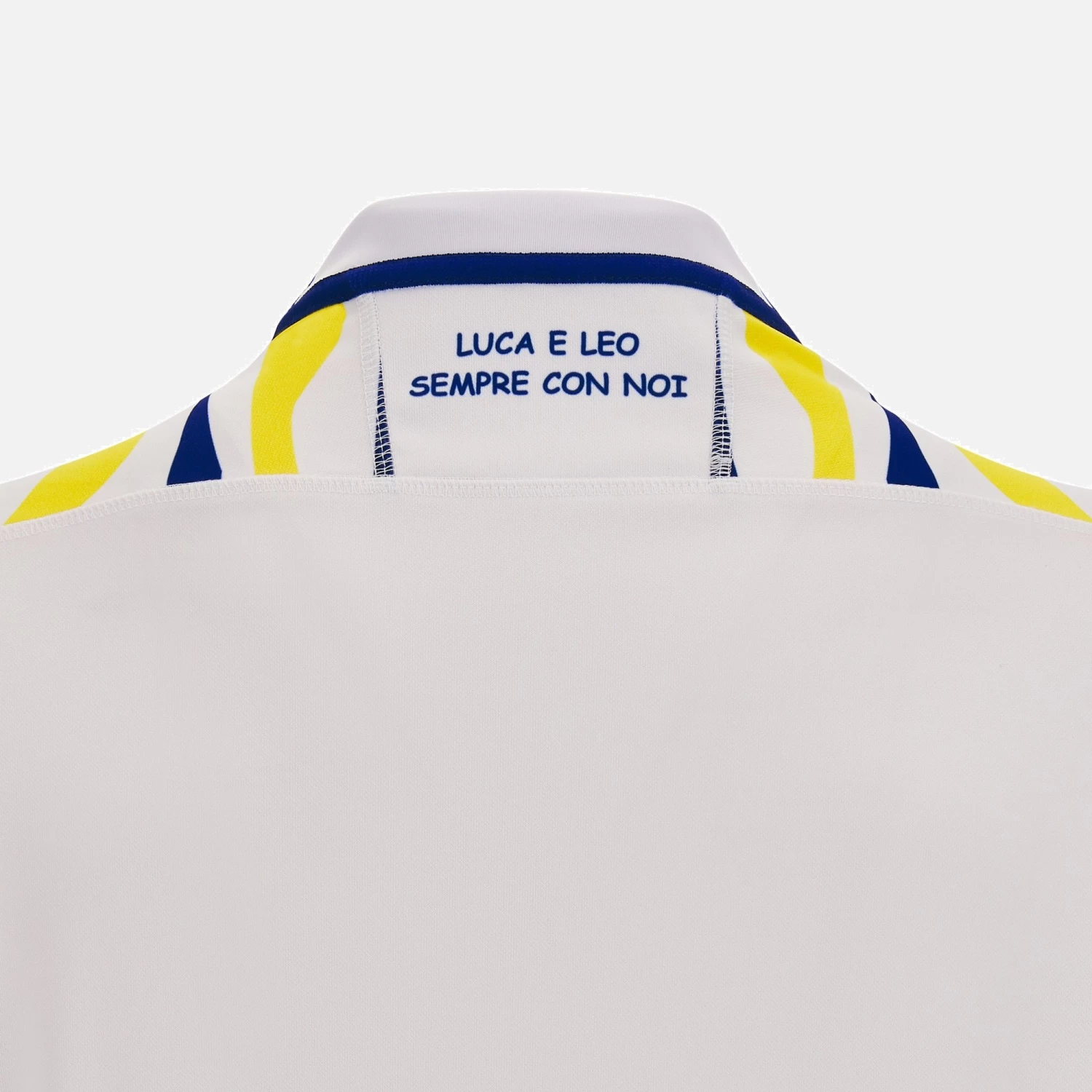 A new away jersey that stands out both on and off the field. Zebre Parma is all set for a new season of matches on opponents’ home turf with a white jersey featuring a blue and yellow zebra stripe design on the shoulders and sides. The back of the collar bears the tribute LUCA E LEO SEMPRE CON noi. The collar edges are embellished with 2 small Italian tricolors. The Eco fabric guarantees superior coolness and breathability.