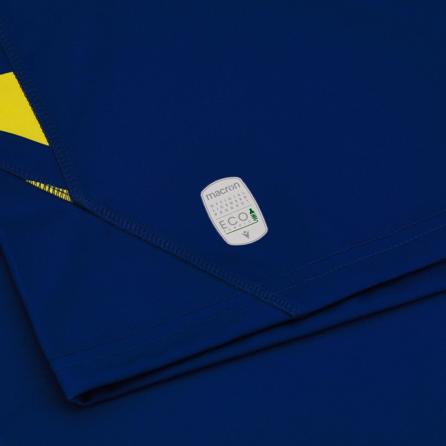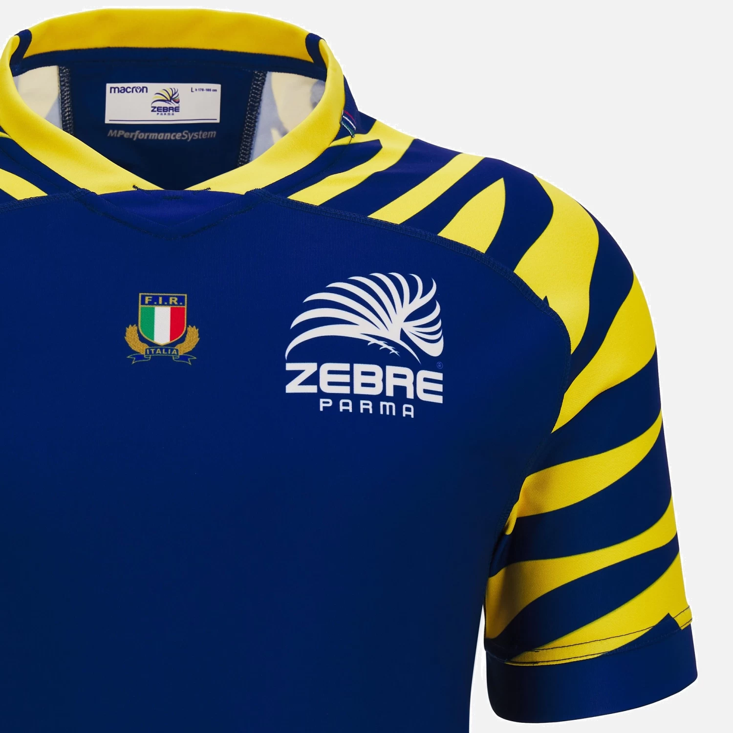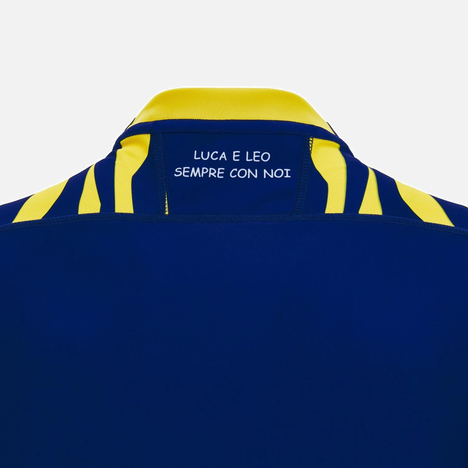A new home shirt designed to impress, both on and off the field. Zebre Parma is all set for the new season with a blue jersey featuring a yellow zebra stripe design on the shoulders and sides. The back of the collar bears the tribute LUCA E LEO SEMPRE CON NOI. The collar edges are embellished with 2 small Italian tricolors. The Eco fabric guarantees superior coolness and breathability.
