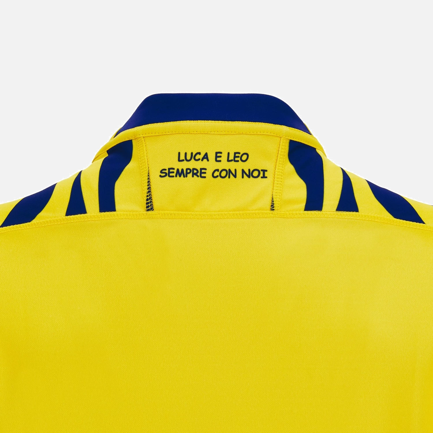 A bold, feisty third match jersey that stands out both on and off the field. Zebre Parma is all set for a new playing season with a third match shirt featuring a yellow and blue zebra stripe design on the shoulders and sides. The back of the collar bears the tribute LUCA E LEO SEMPRE CON noi. The collar edges are embellished with 2 small Italian tricolors. The Eco fabric guarantees superior coolness and breathability.